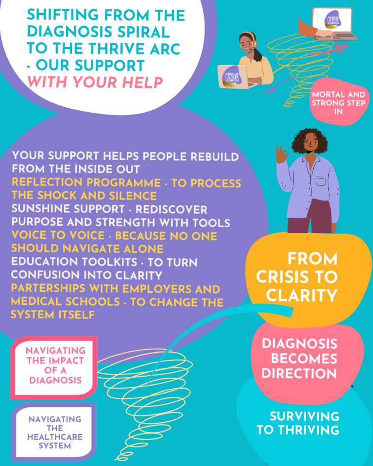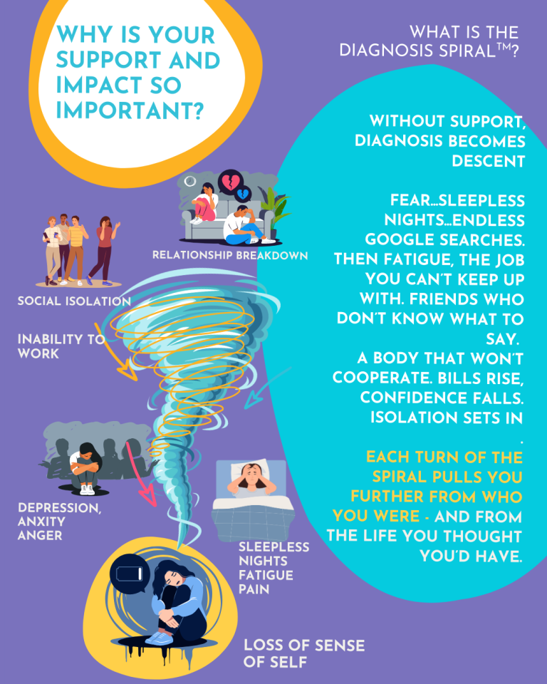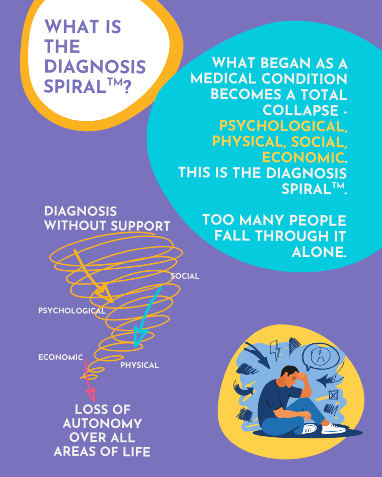 The diagnosis spiral and thrive arc are concepts created by founder Dr Liz Murray - a way of capturing what it is that happens when people are given a major diagnosis but without the right support. The thrive arc is shifting from a place of surviving to thriving, which should be the focus of anyone's health journey.